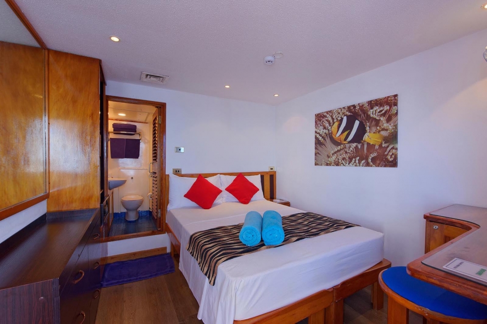 The cabins are basic but comfortable, with a small en-suite toilet and shower. All cabins have air conditioning and can be double or twin beds. The space is tight, with a small wardrobe and some drawers.